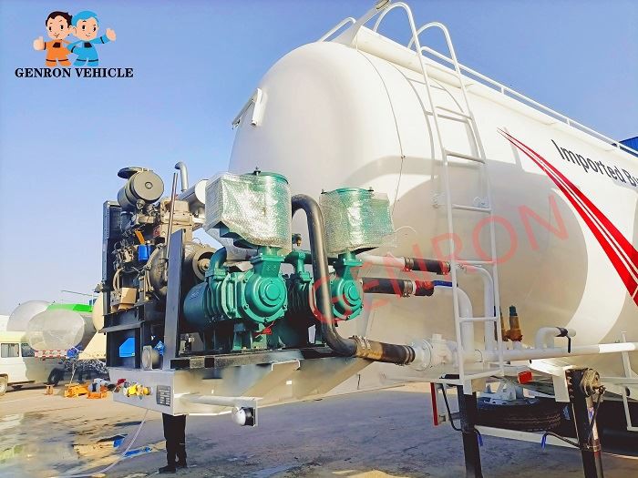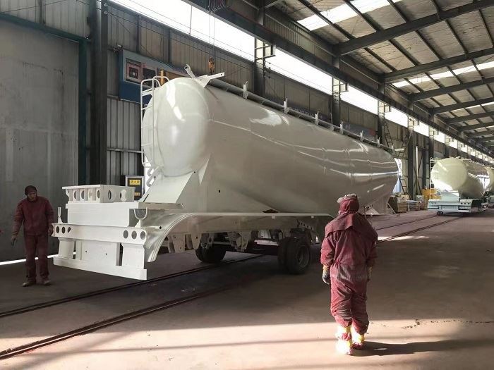 Feature of Lime Tank Powder Semi Trailer: 1. Has a large loading capacity and is widely applicable. 2.the tank material is made of high quality steel plate, and the head is made of 6mm steel plate once by die-casting. The tank body is cylindrical in appearance, and the head is hemispheral, and the head protruding part is nearly 300mm, which improves the pressure resistance of the car. This design can effectively avoid the deformation of the tank. 3. The air compressor is a special vehicle-mounted air compressor, a Sino-foreign joint venture with first-class quality in China. Non-lubrication swing air compressor is specially designed for bulk cement (powder material) truck ideal gas discharge power, compared with other structural forms of air compressor, it is small in size, light in weight, speed matching, easy to install in the car; It has a large displacement, and the discharged gas is oil-free, which can meet the requirements of gas discharge power of cement (powder material). It can adapt to the dust environment and the field environment, has a certain reliability, and basically free maintenance; The maintenance cost is also low, so at present, the air unloading power of domestic bulk cement (powder material) truck is almost all set as non-lubricating swing air compressor. 4.The tank welding all adopts CO2 gas protection automatic welding, welding quality is reliable, beautiful appearance.