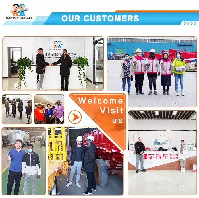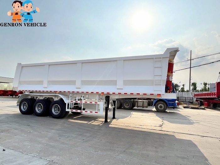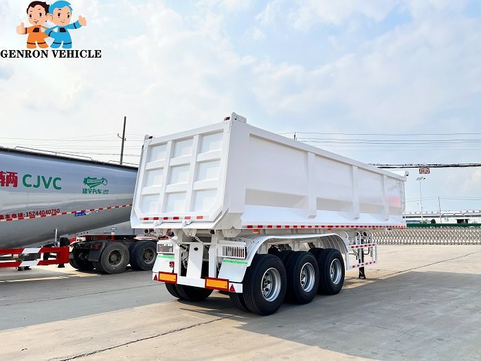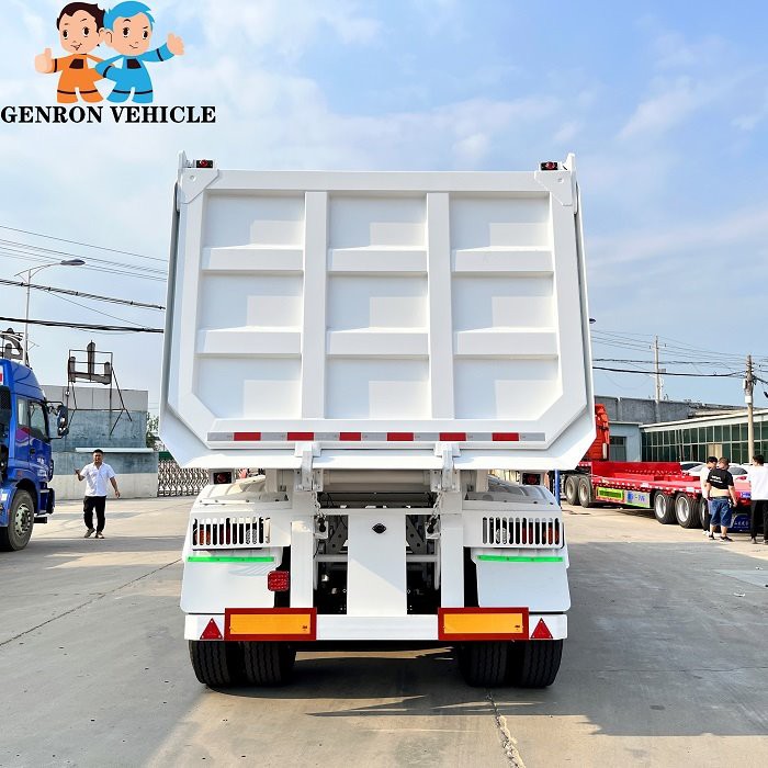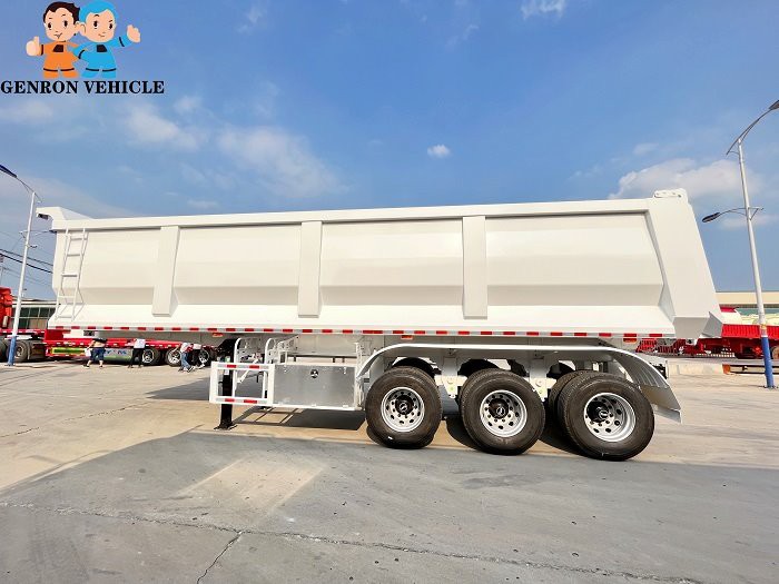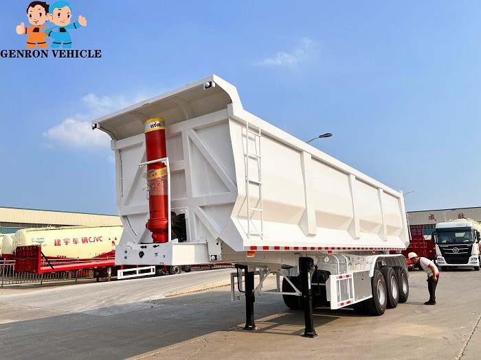 GENRON TIPPER (DUMP) SEMI TRAILER DESCRIPTION: ①Tipping bucket size,shape,box thickness, HYVA hydraulic cylinder and optional fitting (two pieces spare tire carriers, water tank, fuel tank, etc.) ,all can be customized. ② GENRON tipper (dump) semi trailer can be designed separately according to the different needs of customers, or tell us that the medium of the goods you carry is different, and we will design the corresponding models for you to meet the individual needs of customers.